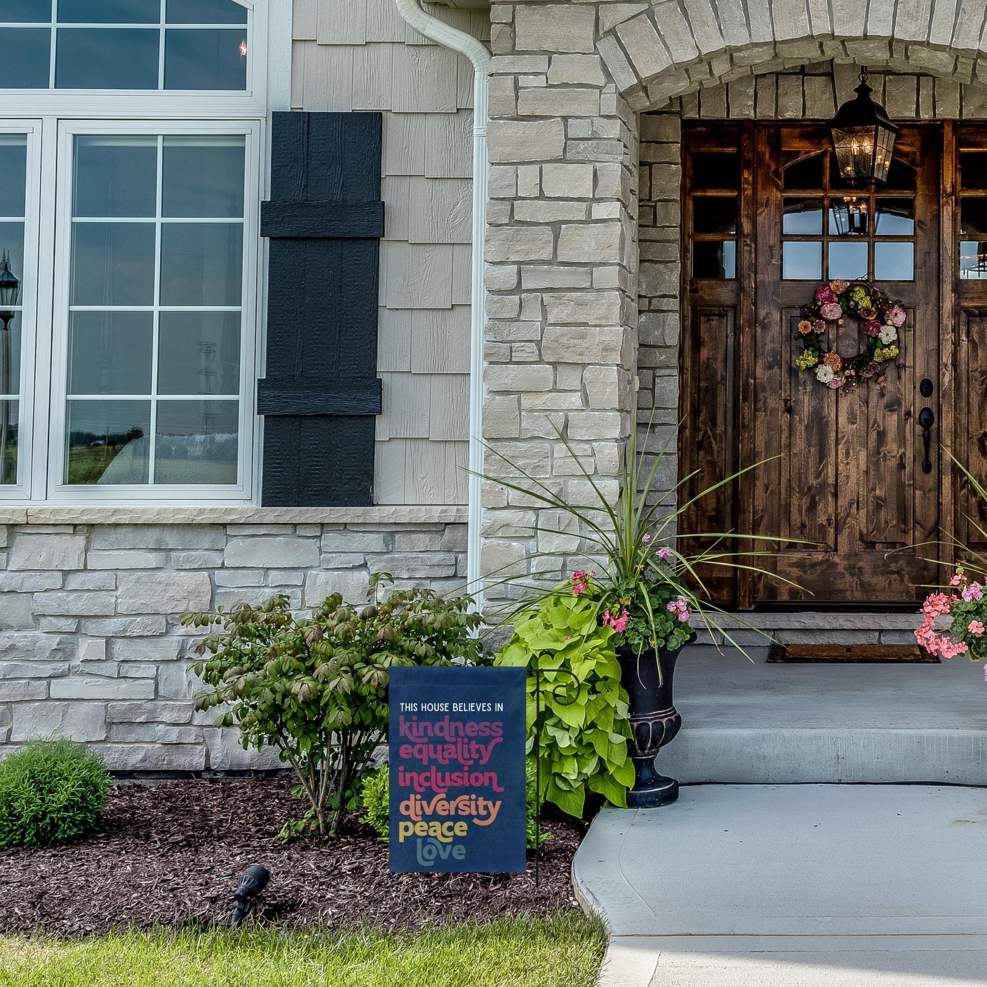 This House Believes in Kindness Equality Inclusion Diversity Peace Love Garden Flag (Navy Blue)